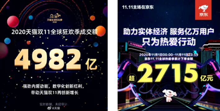 2020年雙十一順利落下帷幕,作為全球消費者共同的狂歡,今年的“雙十一”再次刷新記錄,天貓最終累計成交額達4982億,比去年同期增長1032億,增速26%、成交額過億的品牌474個、過十億品牌30個;京東累計下單金額2715億。
